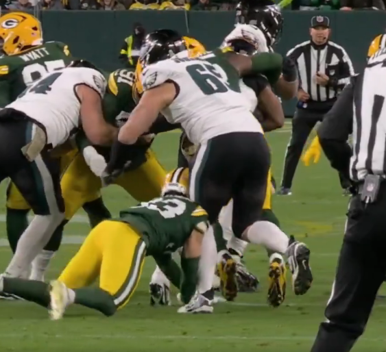 With 8:42 remaining in the opening period, Johnson – the anchor of Philadelphia’s elite offensive line – was engaged in pass protection on a 2nd-and-7 play when Packers edge rusher Rashan Gary powered through the edge. As Johnson attempted to recover, his left leg buckled awkwardly under the force of the collision. In a split-second that replayed in slow-motion horror across national television, Johnson’s knee hyperextended at a sickening 90-degree angle – the kind of visual that makes even the most seasoned NFL viewer wince.