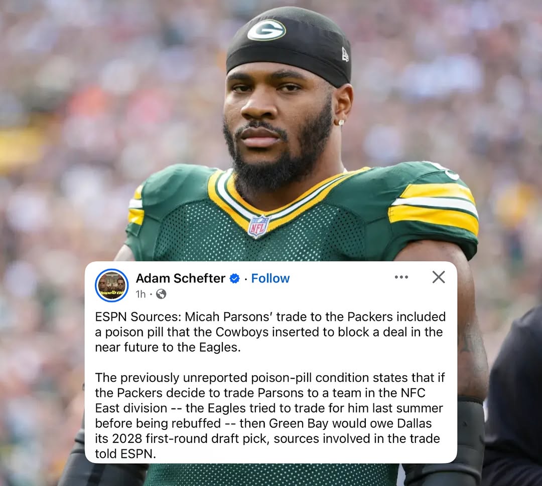 In a stunning revelation shaking the NFL, reports confirm that the Dallas Cowboys deliberately inserted a “poison pill” clause into the blockbuster trade sending Micah Parsons to the Green Bay Packers. The clause ensures the All-Pro linebacker cannot be traded to any NFC East team — particularly the Philadelphia Eagles — without severe penalties. For fans in Pennsylvania and across the league, this revelation feels like a cold, calculated move to crush what could’ve been a hometown fairytale.