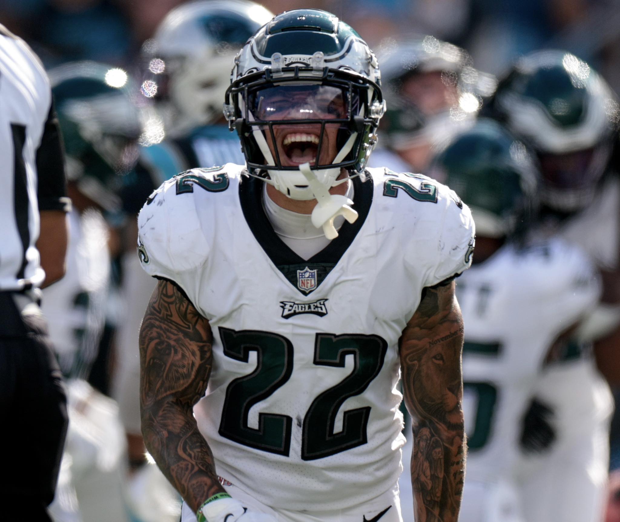 Oct 10, 2021; Charlotte, North Carolina, USA; Philadelphia Eagles safety Marcus Epps (22) reacts after a blocked punt during the second half against the Carolina Panthers at Bank of America Stadium. Mandatory Credit: Douglas DeFelice-USA TODAY Sports