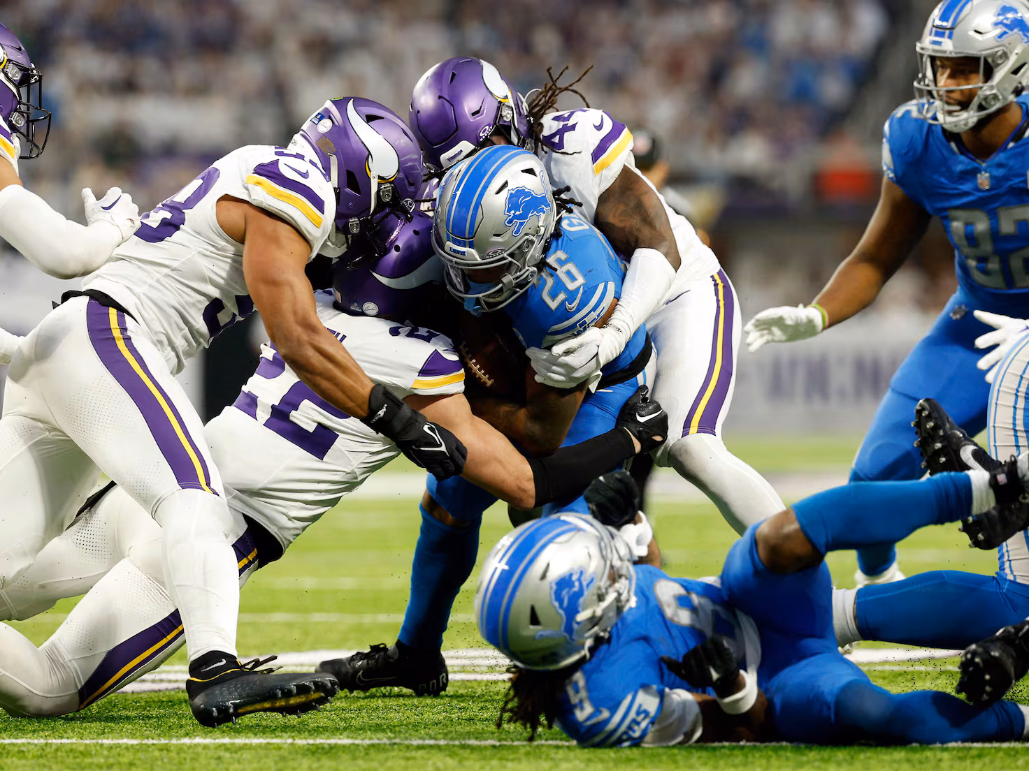 - Lions Offense vs. Vikings Defense: Detroit’s explosive attack (28.7 points, 375.4 yards per game) tests Minnesota’s secondary, which ranks bottom-10 in passing yards allowed (245.3). QB Jared Goff’s precision (68.4% completion) could exploit Vikings CBs Byron Murphy Jr. and Josh Metellus, especially with RB Jahmyr Gibbs’ dual-threat runs.