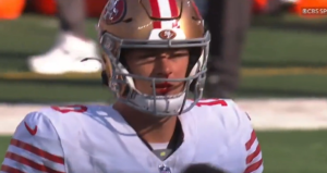 Jones completed all 14 of his passes in the first half and got San Francisco out to a 14-7 lead. Late in second quarter the Niners had the ball again and were trying to extend the lead. Jones dropped back to pass but got sacked by New York’s Rakeem Nunez-Roches. When Jones popped back up the CBS cameras revealed he was bleeding profusely; replay showed the quarterback took an inadvertent shot to the face while attempting to navigate the pocket before getting taken down.